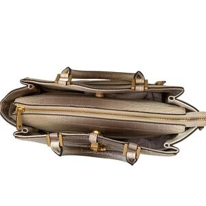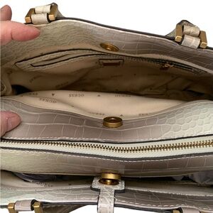 Stylish GUESS satchel with crocodile texture. Elegant beige ombre color with gold accents.