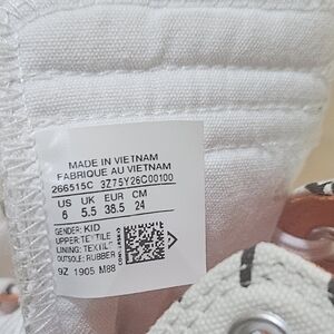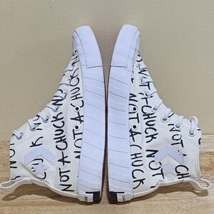Converse Chuck Hi "Not A Chuck" sneakers, Kids' high-top, size US 6 (24cm). They feature the text "NOT A CHUCK" on a white canvas. Comfortable and stylish for everyday wear. Excellent Preowned Condition. In very good condition with few visible signs of use. Please see all images for the complete condition of the item.