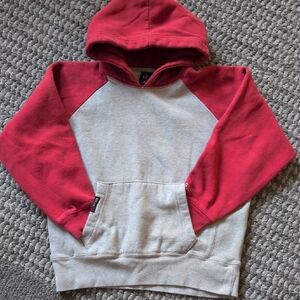 Cozy hoodie with red sleeves and gray body. Ideal for casual outings.