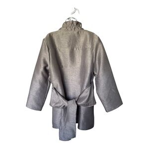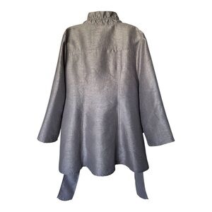 Yushi silver gray swing coat with a tie waist. Features a button-up front and elegant design. Poly rayon blend. Fabric has raw silk texture. Hand wash. Bust 23” length 31”. Excellent like new condition. Size XL