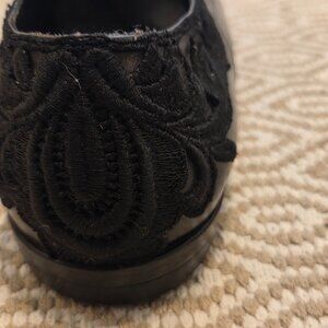 These are circa 1985 black leather oxfords by Stephane Kelian with black guipure lace trim . They are in good condition, the leather and lace are beautiful with no scratches or flaws. Size is 9 1/2. I am selling them because they are now too small for me.