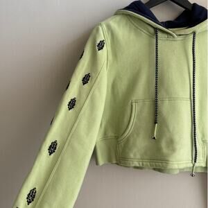 Features: Soft, cozy fabrication; embroidered detail at shoulder and sleeves; drawstring adjustable hoodie; large kanga pocket; locker loop at back; small pocket at left arm with invisible zipper; thumbholes at cuffs; two-layer hood with soft jersey interior.
