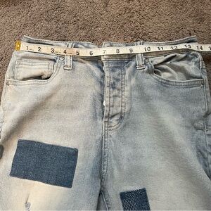 Stylish light blue jeans with unique patchwork. Relaxed boyfriend fit. Perfect for casual wear.