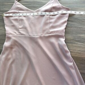 This stunning pink gown by Show Me Your MuMu features a sleeveless design with delicate spaghetti straps and a subtle V-neckline. The flowing A-line skirt and fitted bodice create a timeless silhouette, perfect for weddings or formal occasions. Crafted from a light, airy fabric, it offers a graceful and elegant look.