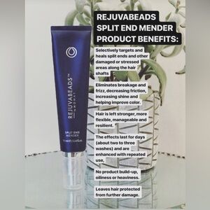 Independent testing has demonstrated that REJUVABEADSTM resulted in a 100% repair of split ends 3mm long and under within one minute following application. The product selectively targets and heals split ends and other damaged or stressed areas along the hair shaft, eliminating breakage and frizz, decreasing friction, increasing shine and helping improve color. Hair is left stronger, more flexible, manageable and resilient. The effects last for days (about two to three washes) and are enhanced with repeated use, without creating build-up, oiliness or heaviness. Leaves hair silky smooth, polished and protected from further damage.