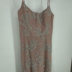 Chic blush maxi dress with intricate lace. Perfect for elegant events.