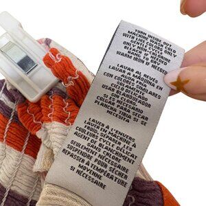 One 5 One wide leg pants with an elastic smocked waistband and flowy silhouette. Lightweight rayon fabric with vertical multicolor stripes in purple, rust, pink, cream, and white. Easy pull-on style that’s comfortable and breezy — great for warm weather, festivals, or casual everyday wear.