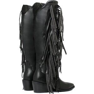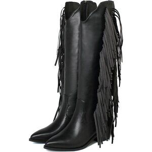 Women Black Synthetic Fringe Tassels Pointed Toe Knee High Western Cowgirl Boots