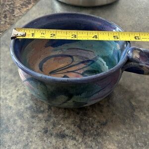 This gently used handcrafted pottery bowl features a stunning blend of blue, purple, green, peach and cream hues. Perfect for adding an artistic touch to your home decor or use as a soup bowl! Nice twisted handle too. This is a solid piece in excellent condition - no chips no cracks!!!!
