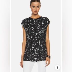 Helmut Lang Strata lightweight short sleeve gray black jersey top. Top is sleeveless with a cap sleeve look. Solid black on back and front is black with gray and white design. Soft stretchy lightweight material. Can be worn tucked in or untucked. Super easy and comfortable to wear. Women’s size medium. See pictures for approximate measurements. Excellent condition.