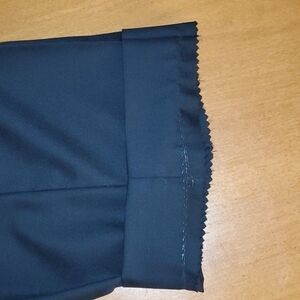 Black, 100% wool, flat front, tailored but can be tailored to desired length. Dry clean only.