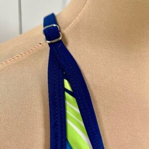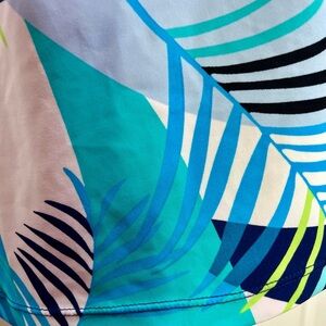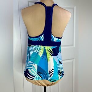 Dive into style with this vibrant blue and green leaf print swim top. Perfect for a day at the beach or pool.