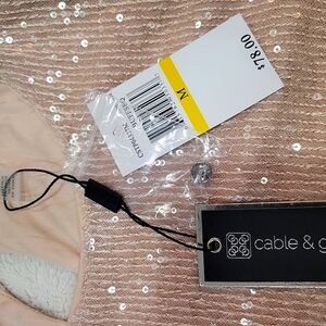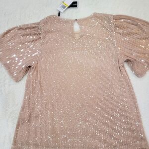 This elegant blouse from Cable & Gauge features a soft cream color with shimmering sequin embellishments, adding a touch of glamour to any outfit. The flutter sleeves and neckline create a feminine silhouette, making it perfect for both casual and dressy occasions.