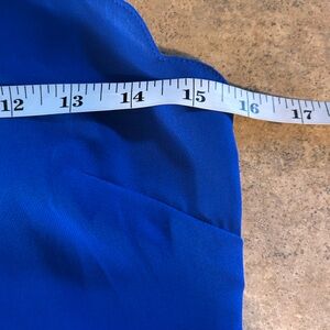 Vibrant royal blue sleeveless dress with scalloped neckline. Adjustable straps, underarm zip closure, fully lined. Clean and in good condition!