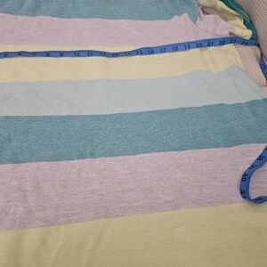 Vibrant polo with teal, light blue, and lime stripes. Comfortable and stylish for any occasion.