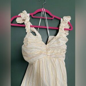 Chic cream dress with gold accents. Features textured fabric and subtle shimmer. Summery. Romantic. Date night. Feminine. Playful. Effortless. Colorful. Beachy. Vacation. Weekend getaway. Resort. Cruise. Baby shower. Garden party.