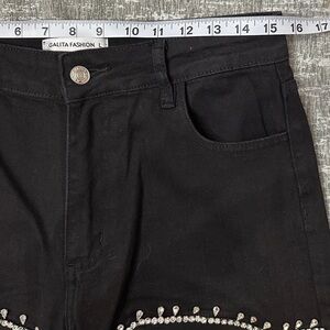 Step out in style with these elegant black wide leg jeans, featuring eye-catching cut-out details with gems. Perfect for a fashionable look. Please see pictures for measurements. These jeans do stretch a little but are pretty rigid.