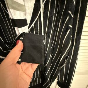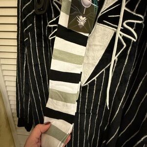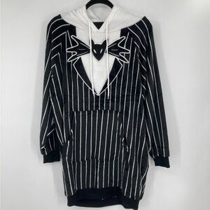 Cozy Jack Skellington pajama set. Features black and white stripes. Hood with Jack Skellington face.