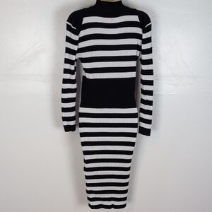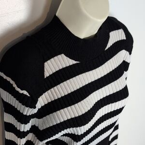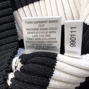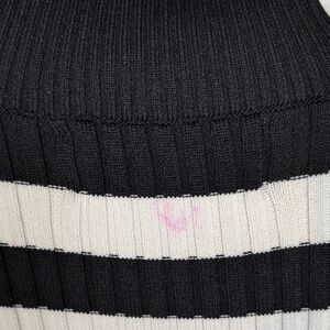 Black and white horizontal stripes. High collar. Long sleeves. Pull on style. Stretchy material. A light pink stain on the back of the neck (see photos), but otherwies in excellent condition -- no holes or fraying. Laid flat pit-to-pit: 19.5in. Laid flat waist: 12.5in. Shoulder to hem: 43in.