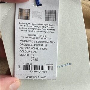 Classic Burberry trench coat in tan. Features a stylish belt and iconic check lining. Ideal for chic layering.