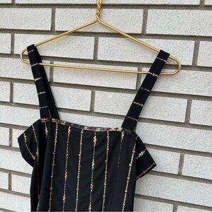 Joseph Ribkoff black sleeveless corset-style tank top featuring an elegant gold chain stripe print throughout. Designed with wide shoulder straps, a structured bodice, and a flattering straight neckline for a polished, sculpted fit. Fabric has stretch for comfort while maintaining its tailored shape. Made in Canada from a soft, smooth knit with subtle sheen. Hand wash cold, hang to dry, low iron on reverse only. Excellent used condition with no noted flaws. Size 12.