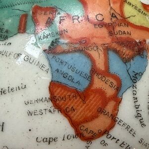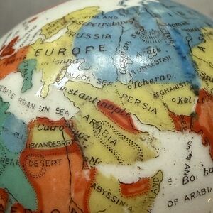 This is a ceramic globe with detailed hand painted map of the world, the names of many countries are in the older versions in early to mid 1900s. It is vintage or possibly antique, marked made in Japan. Excellent vintage condition without any damage or cracks.