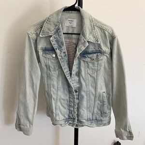 Classic denim jacket with a faded blue wash. Features button closures and front pockets. Ideal for casual wear.