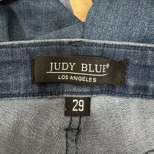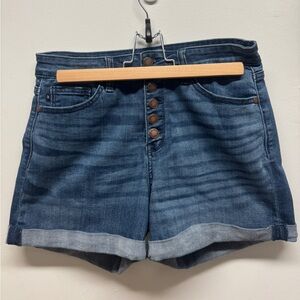 Chic dark wash jean shorts with button fly. Rolled hem adds style.