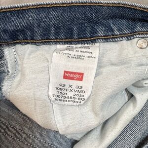 Authentic Wrangler jeans in blue. Features a straight leg and signature back pocket design. 42 x 32, EUC from a smoke free home. Back pocket has a slight wallet worn mark.