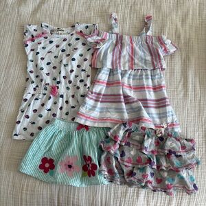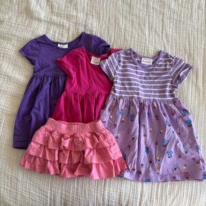 Charming pink dress with unicorn design. Features playful striped sleeves.