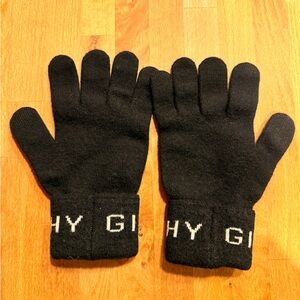 Stylish black knit gloves. Features bold Givenchy logo. Perfect for warmth and style.