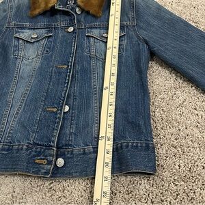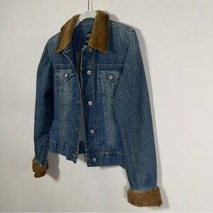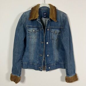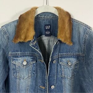 Classic GAP denim jacket featuring added genuine fur trim at the collar and cuffs. Fur is backed with natural hide and appears to be real animal fur, however exact animal type is unknown and unverified.