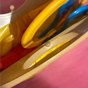 It is a nostalgic yellow preschool toy purse from 1982 featuring a cute strawberry design. Made by Fisher-Price, this toy is perfect for imaginative play, allowing children to dress up and pretend. It does have a small stain on it. But everything is included -