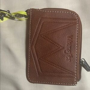 Compact Wrangler card holder. Teal and brown pattern. Includes a yellow strap for easy carrying.