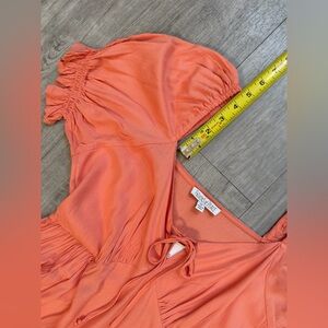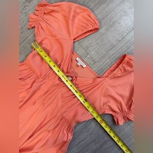 Elevate your wardrobe with this stunning Patrons of Peace dress in the beautiful, earthy Pink Clay hue. This New With Tags (NWT) piece perfectly captures the Cottagecore and Bohemian aesthetics trending this season. Designed with a flattering feminine silhouette, this dress features a rounded neckline with a key hole detail, a drawstring tied detail on neckline, elastic straps on short puff sleeves, a ruffled elastic cuff on sleeves, pleated details on lower top, a long flowy skirt, a high low hem with ruffled details.. The lightweight, breathable fabric makes it a go-to vacation, brunch, or as a wedding guest dress.