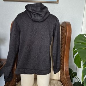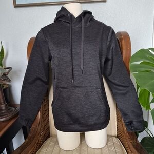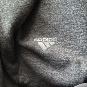 Comfortable adidas hoodie in dark gray. Features drawstrings and a front pocket. Perfect for casual wear.