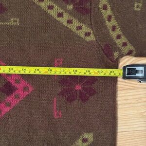 Great condition, adorable design. Cozy crewneck sweater with geometric patterns. Features rich brown and vibrant red accents. Ideal for casual wear.