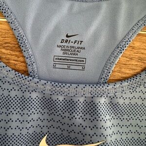 Stay supported and comfortable through every workout with this Nike Dri-FIT Swoosh sports bra. Features a subtle blue dotted pattern, racerback design for full range of motion, and sweat-wicking fabric to help you stay dry and focused.