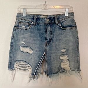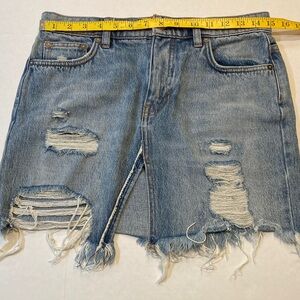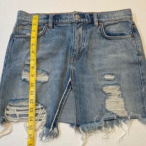 Trendy light blue denim mini skirt. Features a stylish front slit and distressed details. Ideal for casual outings.