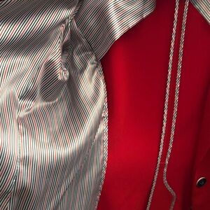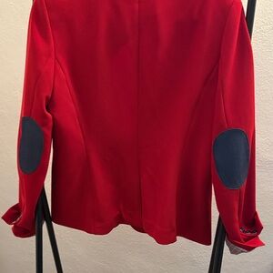 Stylish red blazer. Features blue accents. Perfect for any occasion, would be great with jeans or dressed up!