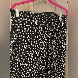 Chic wide leg pants with a bold black and white spots pattern. Paperbag tie waist; elastic waist, pull on styling. Worn only once; excellent condition.