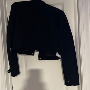 Chic black suit jacket with sleek design. Features button closure. Perfect for formal occasions.