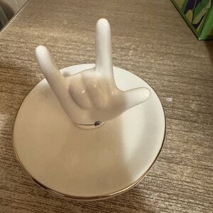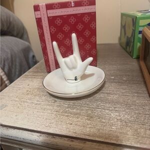Brand new! Only took out of box! Was not exactly wha I was looking for! Cute ring holder, jewelry trinket dish, etc. can be used for many different things! Has “K” initial, has “I love you” hand signal as ring holder, white with gold colored trim
