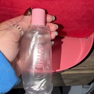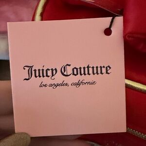 Elegant red velvet case with Juicy Couture logo. Features gold zipper and bow detail.
