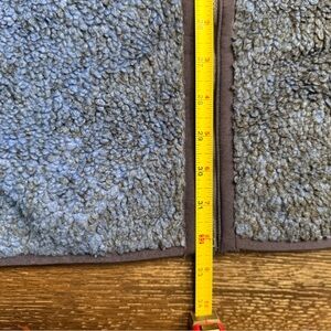 Vibrant fleece jacket with orange, red, and blue hues. Features a front pocket and zip closure.