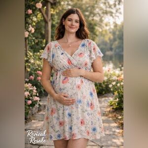Stay stylish and comfy with this lovely Jessica Simpson maternity dress! Featuring a soft blush-pink base with a pastel floral print, flutter sleeves, a V-neckline, and empire waist – perfect for baby showers, spring outings, or everyday wear.