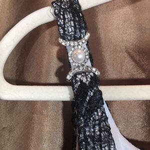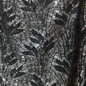 Black lace over silver sequin lining fitted gown with jeweled shoulder detail and back slit.