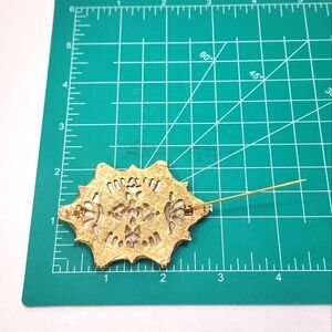 Beautiful iridescent oval shell/abalone brooch with pearl accents. Pre-owned in excellent condition.