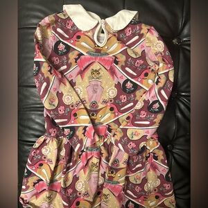 Charming dress with a whimsical cat pattern. Features a classic white collar.