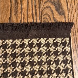 Elegant Versace scarf with classic houndstooth pattern and fabulous fringe. Perfect for stylish ensembles. A full 63”x 14.” Note there’s a small part of trim that was damaged (but has stayed constant since and area seems to blend in with fringe), see photo, otherwise in great condition and priced accordingly.